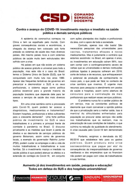 Em uma crise sanitária como a provocada pelo Covid-19, quem poderá ter acesso a diagnósticos, medicamentos e tratamentos? Existem hospitais, profissionais e leitos suficientes para a crescente demanda? Uma forte política pública de investimento no SUS e seus trabalhadores é a primeira e principal frente de combate à pandemia no Brasil. O discurso privatizante e as medidas que levam à perda de direitos e ao desmonte de serviços públicos do governo Bolsonaro, assim como de governos locais, a exemplo do governador Ratinho Junior (PSD), podem custar os empregos e até a vida de muitos trabalhadores e trabalhadoras e suas famílias. Só o investimento maciço e imediato na saúde pública é que poderá atenuar os efeitos e a extensão do contágio do Covid-19, em conjunto com ações planejadas dos órgãos e profissionais da área, com o apoio de toda a sociedade.