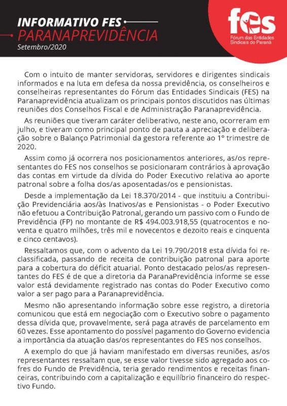 Essa e outras informações estão contidas no Informativo FES – Paranaprevidência, elaborado pelos representantes das trabalhadoras e trabalhadores do Estado que são membros dos conselhos Fiscal e de Administração da Paranaprevidência.