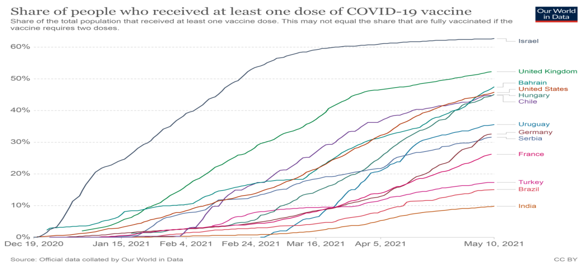 Este mapa, que apresenta o levantamento dos dados até o dia 10 de maio de 2021, deixa clara a situação que o Brasil se encontra no quesito vacinação e só está na frente da Índia porque, neste momento, este país vive um surto avassalador da doença.