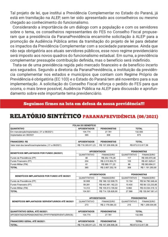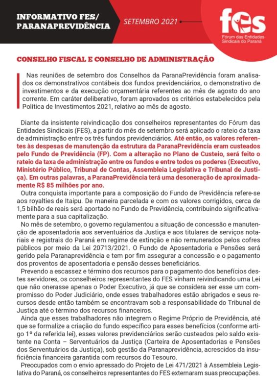 Saiu o novo boletim de prestação de contas dos conselheiros da Paranaprevidência que são ligados ao Fórum das Entidades Sindicais (FES).