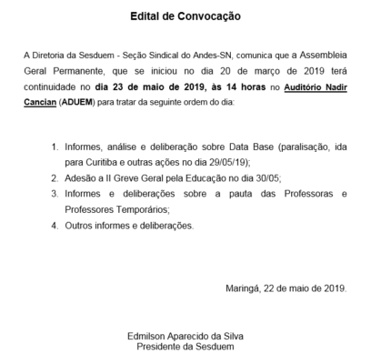A Diretoria da Sesduem – Seção Sindical do Andes-SN, comunica que a Assembleia Geral Permanente, que se iniciou no dia 20 de março de 2019 terá continuidade no dia 23 de maio de 2019, às 14 horas no Auditório Nadir Cancian (ADUEM) para tratar da seguinte ordem do dia: