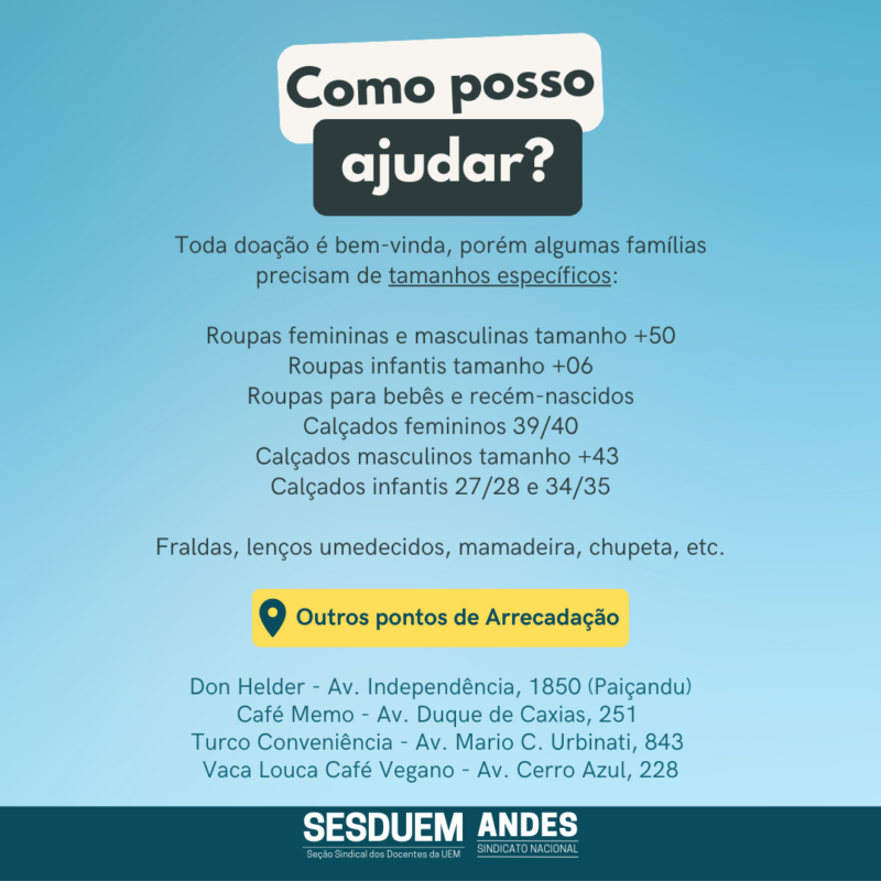 A Sesduem, como sindicato que busca apoiar as lutas da classe trabalhadora, pede a todos que puderem fazer contribuições com roupas, brinquedos e recursos financeiros.